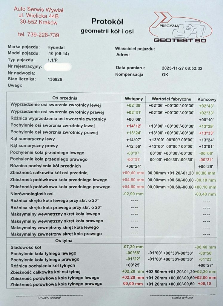 Po naprawach które mogą mieć wpływ na zbieżność, geometrię samochodu wykonujemy regulacje a efekt ten zostaje przekazany klientowi w postaci protokołu.
