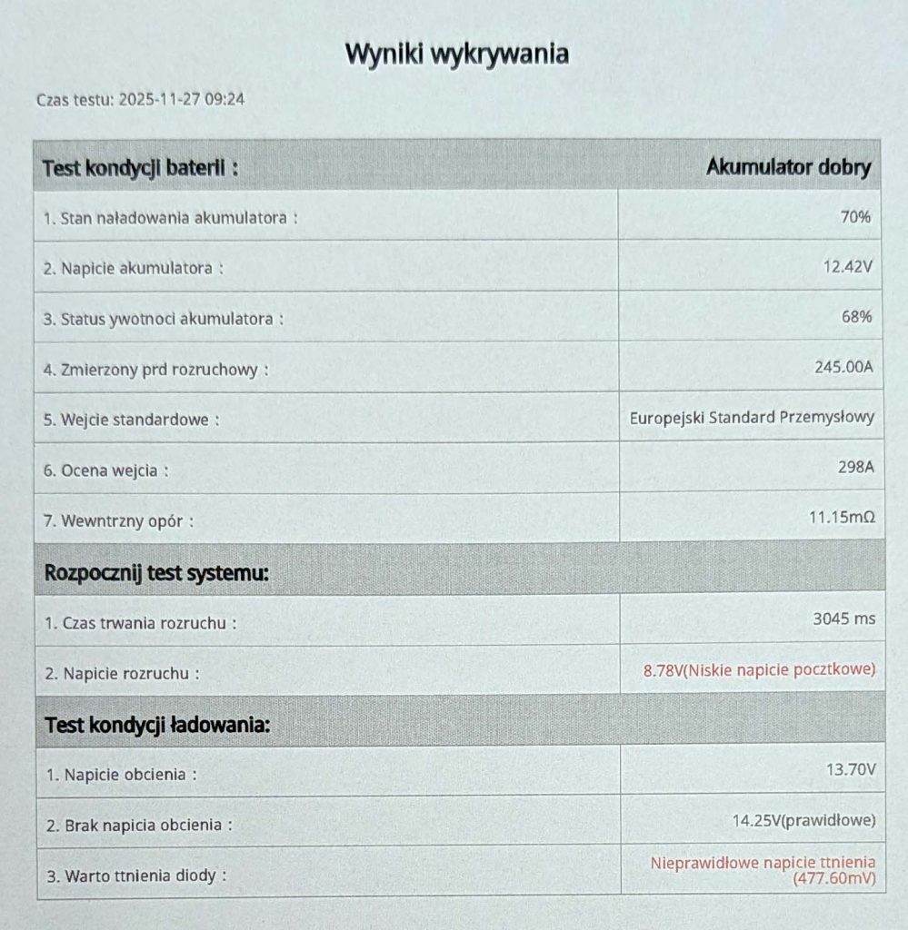 Na samym końcu testów wykonywany jest test alternatora. Sprawdzane są parametry ładowania czyli napięcie oraz poziom tętnień.